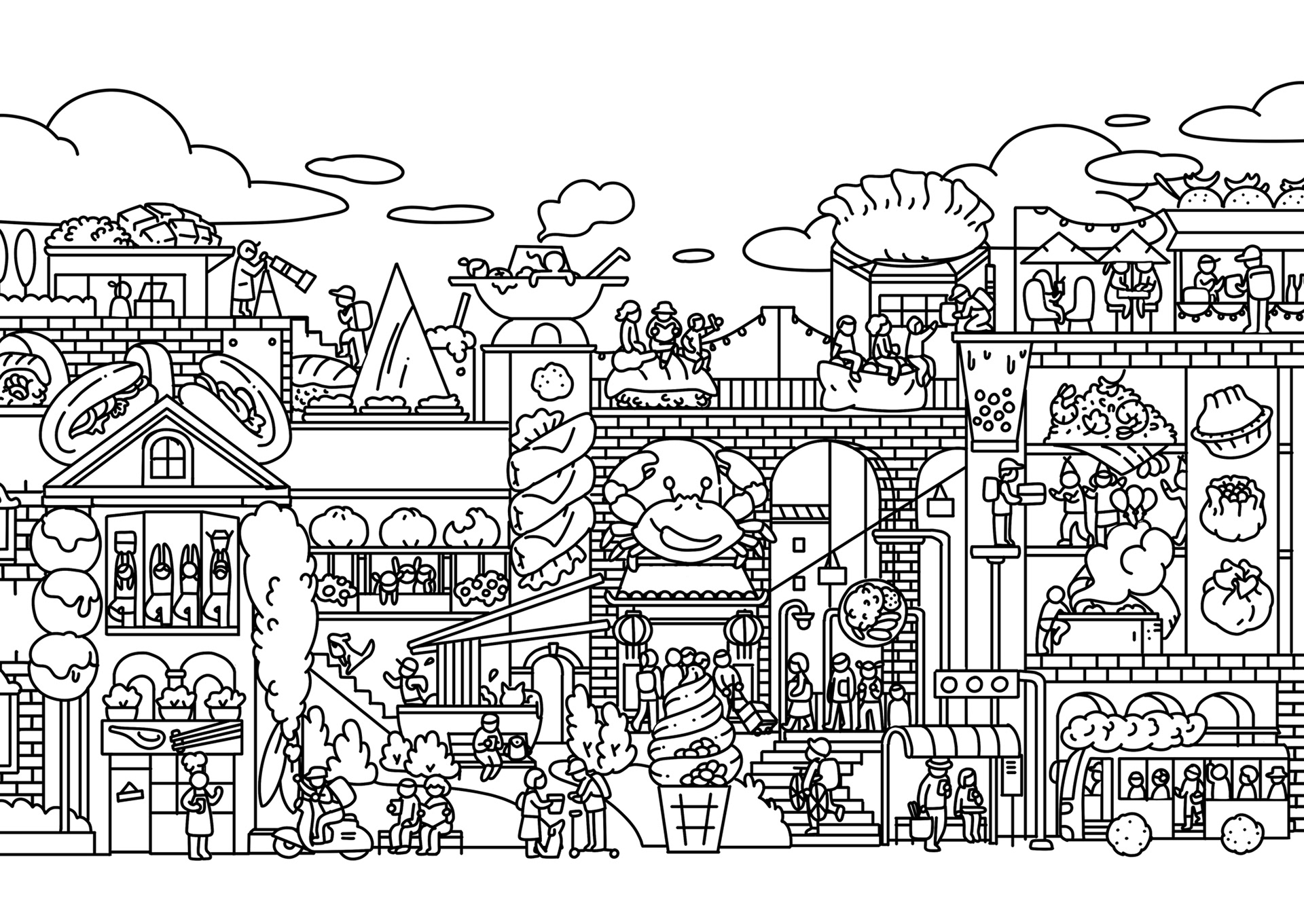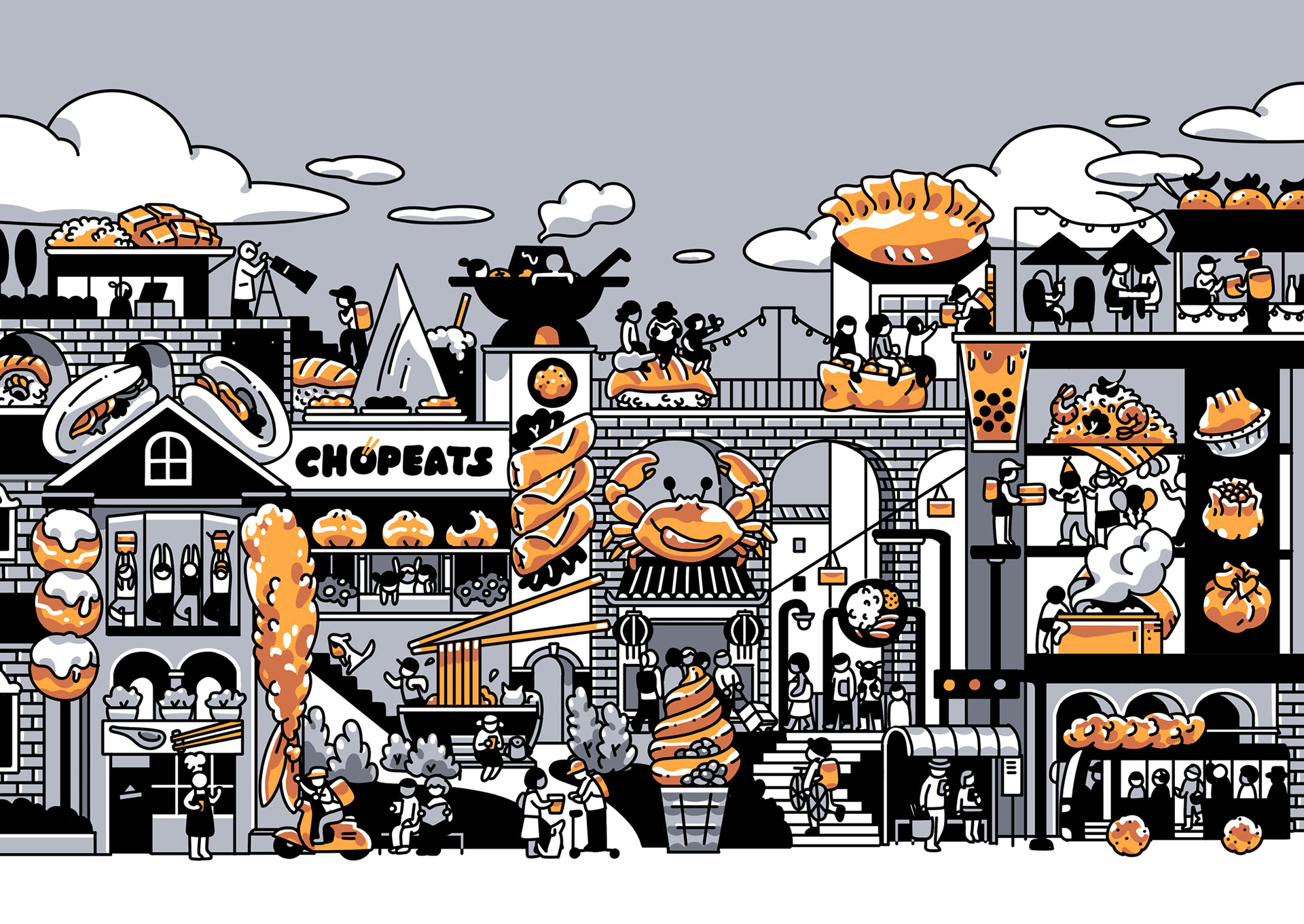 Food city illustration for Chopeats, a food delivery app specializing in asian food.