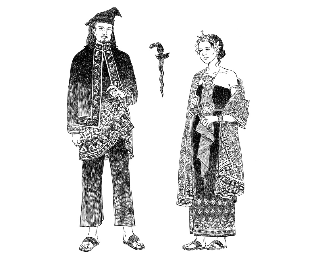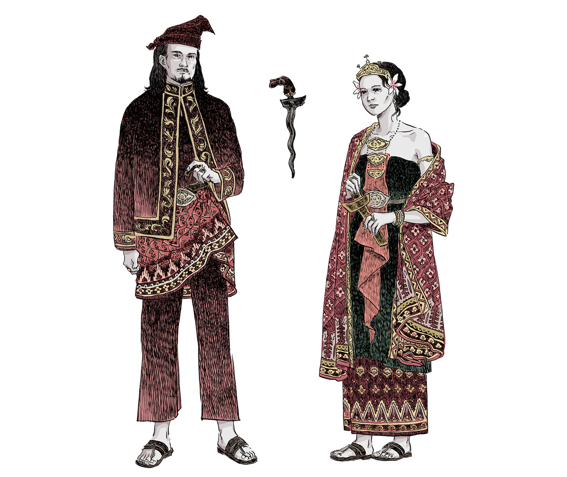 This was drawn for a Romanian card game that features pairs in traditional clothing from around the world. Representing Malaysia, I chose to draw Cik Siti Wan Kembang, the iconic queen of Kelantan in 14th century, and a male aristocrat.