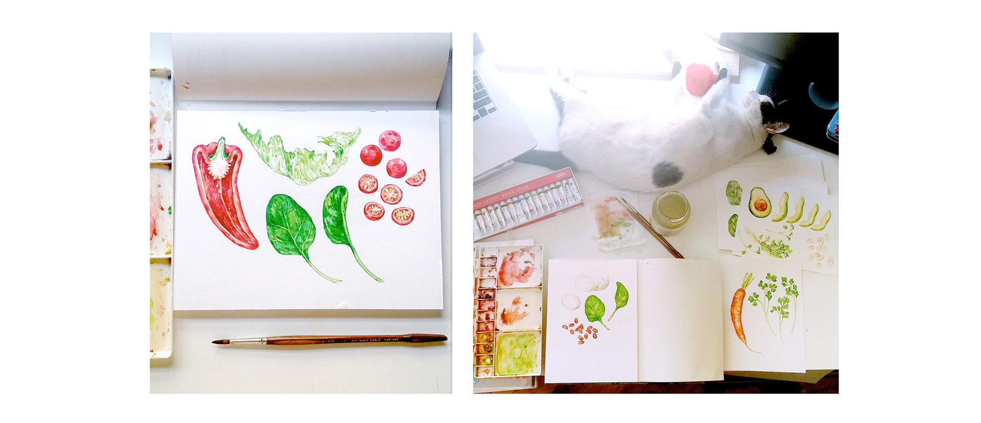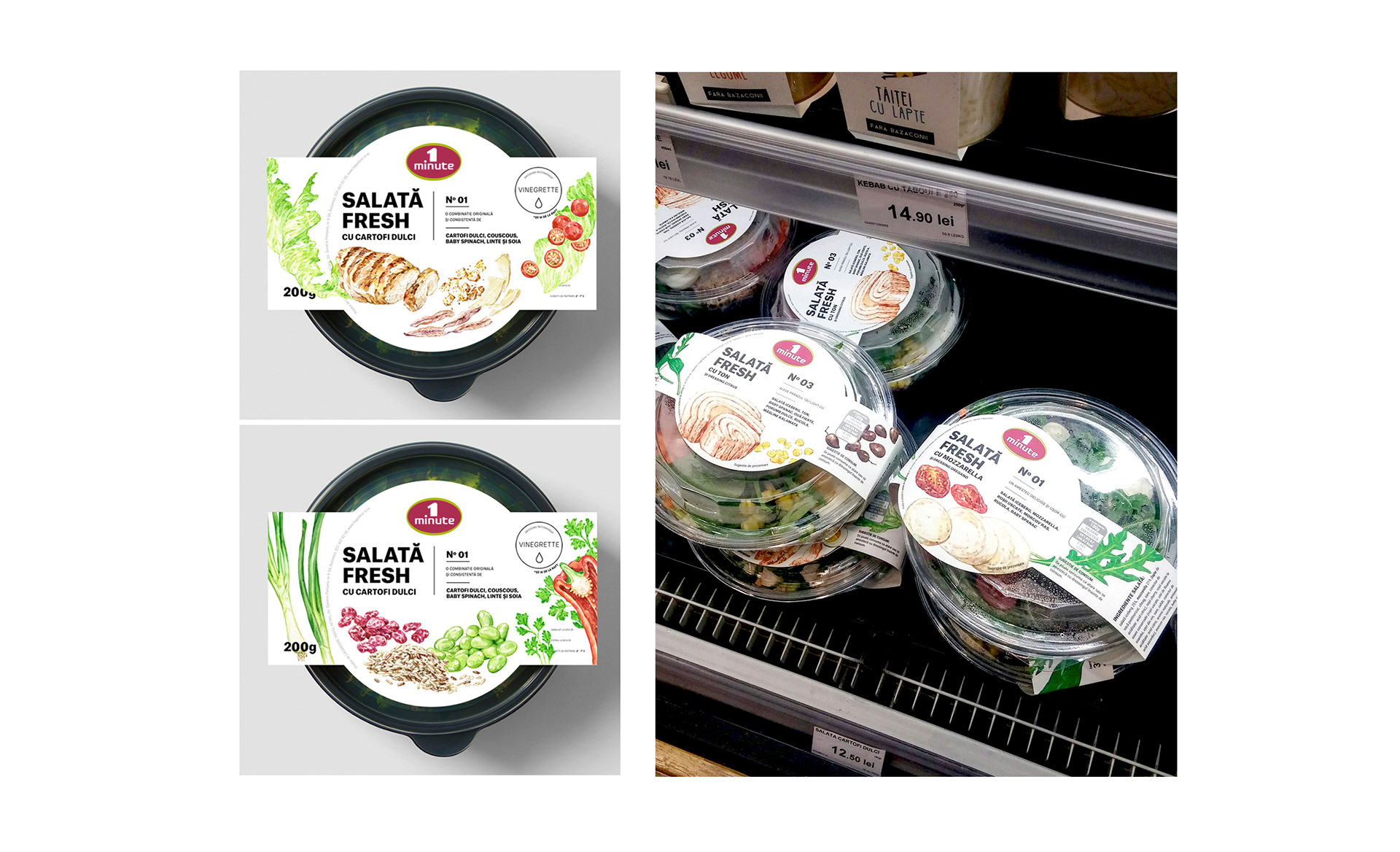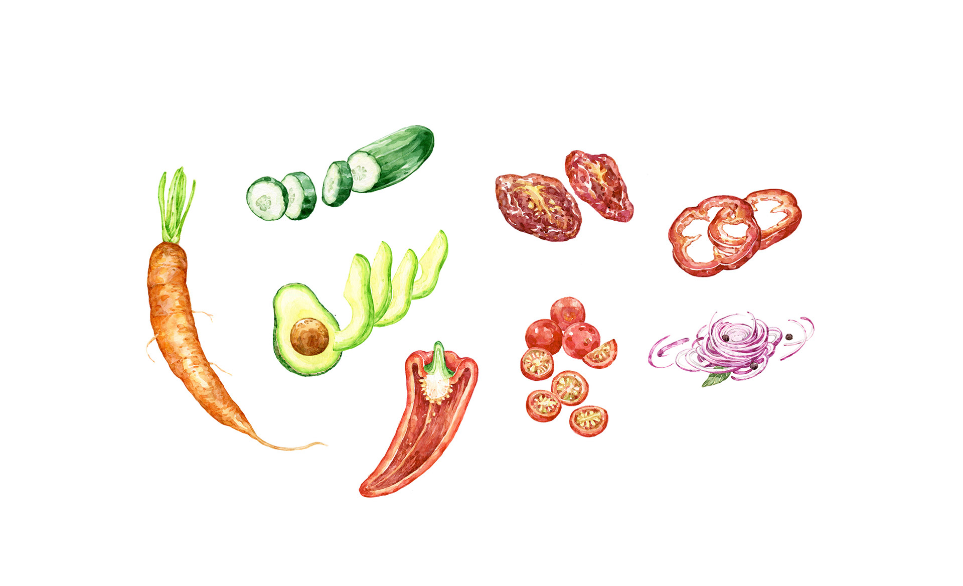 Food painted in watercolors for salad packaging for Salata 1minut.