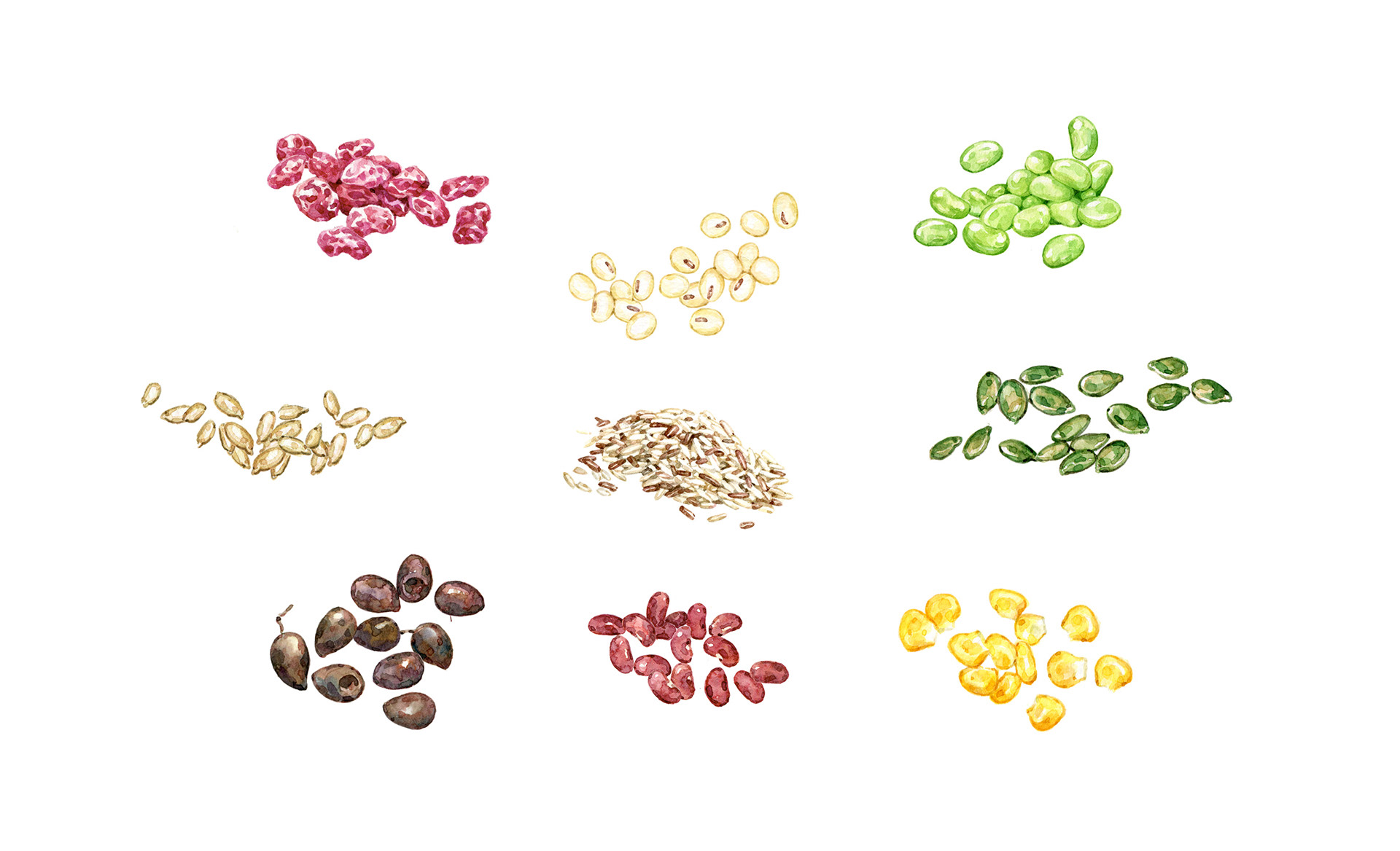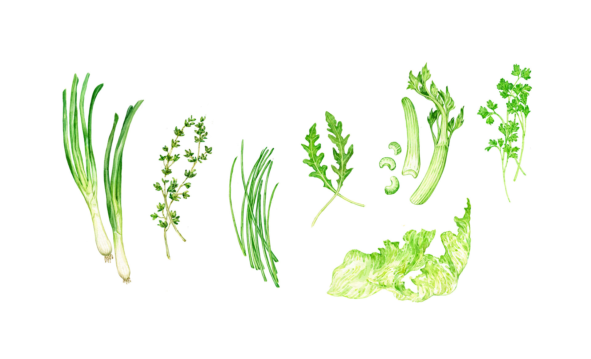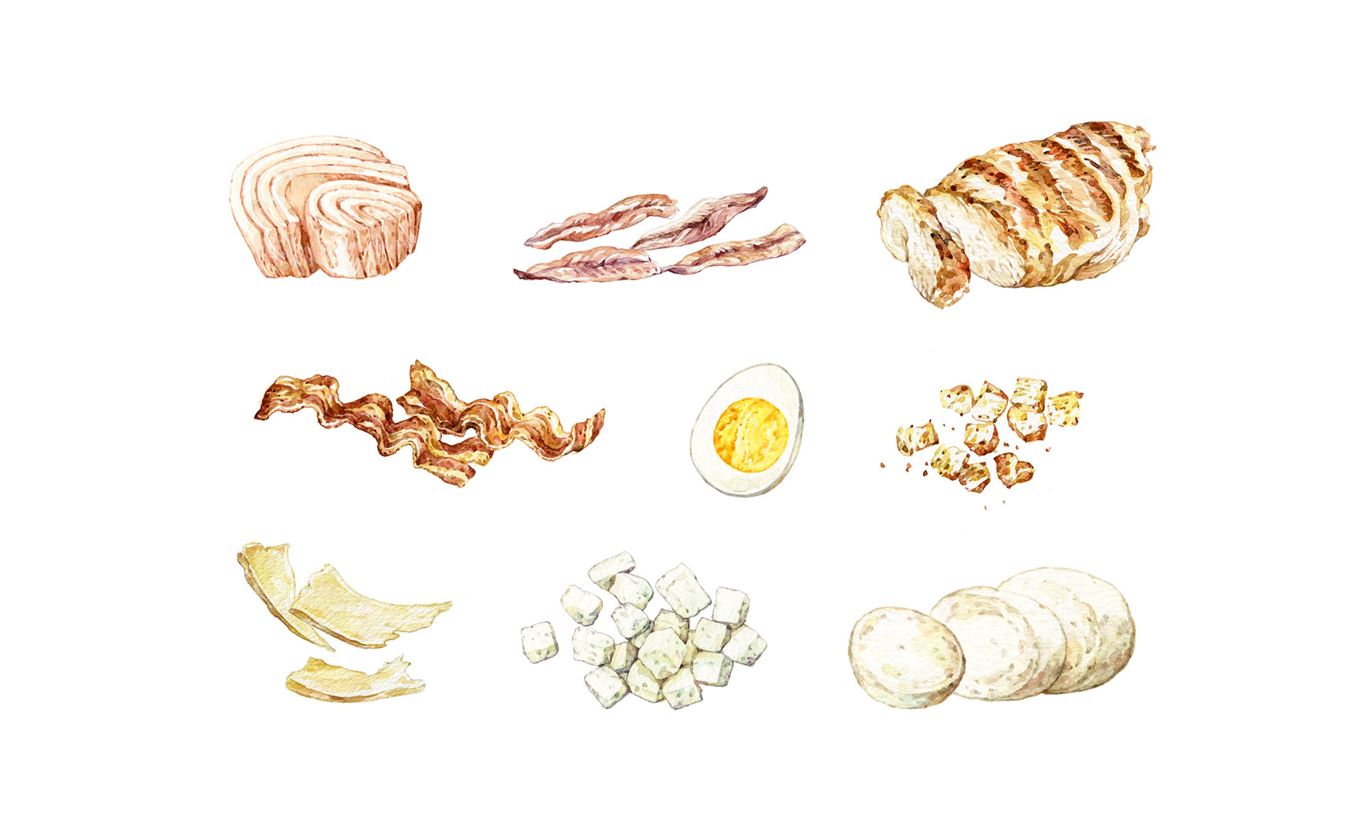 Food painted in watercolors for salad packaging for Salata 1minut.
