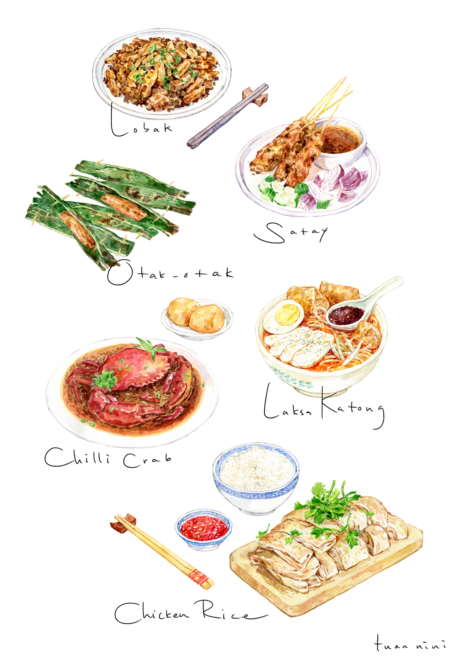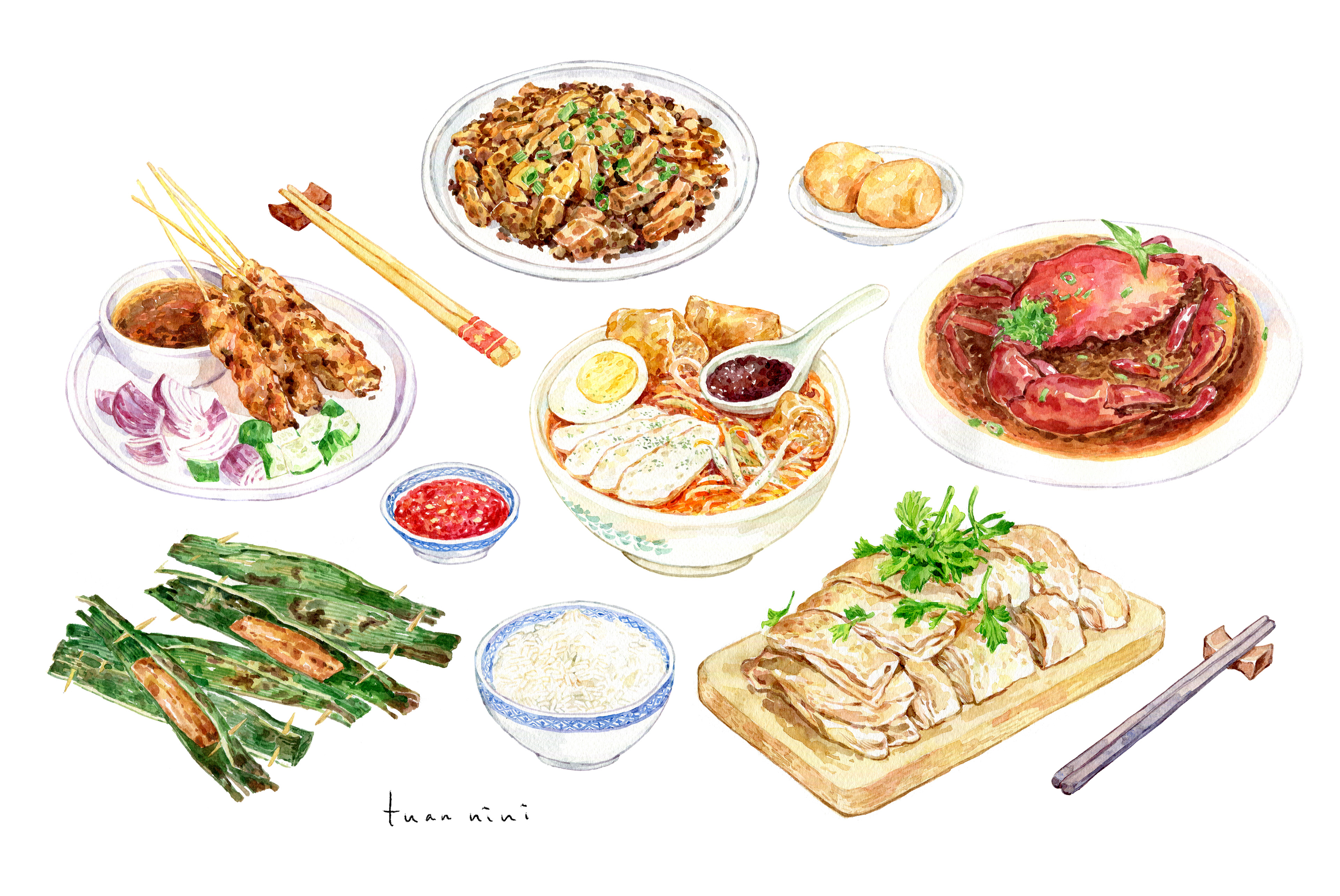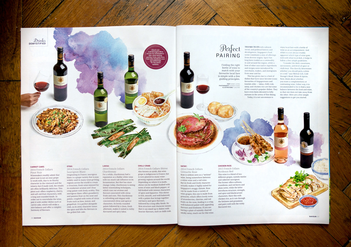 Commission by SPH Magazines for Savour magazine of Cold Storage Singapore for an article about pairing local dishes with wine. Thank you art director Fish Chan!